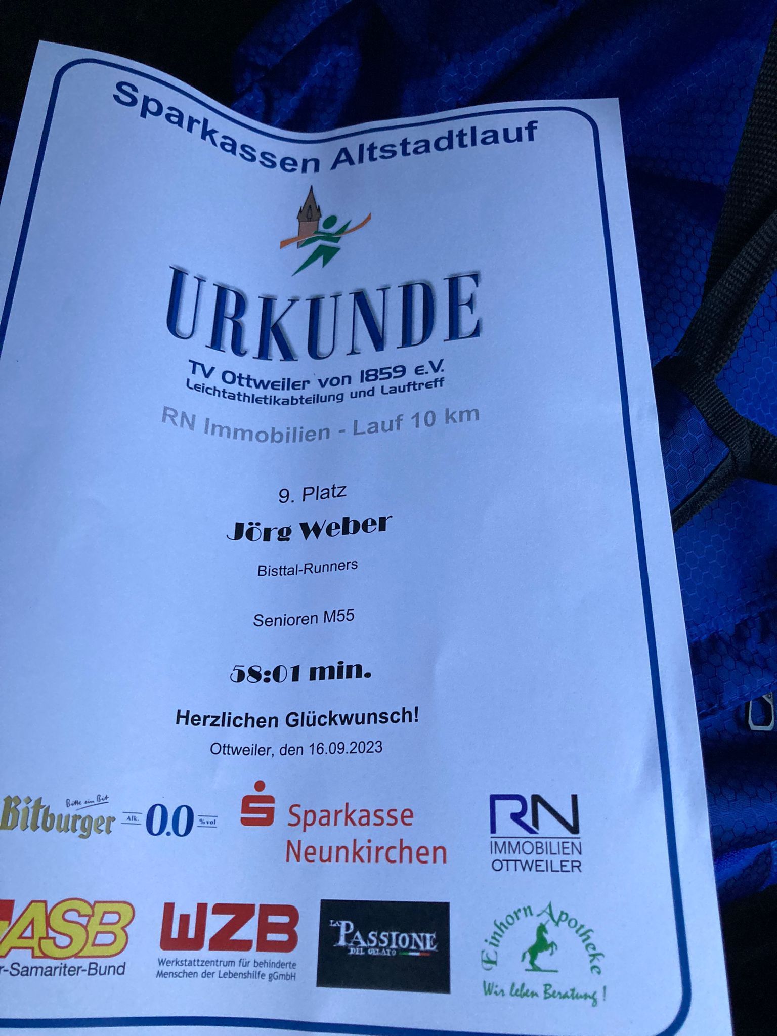 Für die zwei teilnehmenden Bisttal-Runners war der Lauf besonders erfolgreich: Barbara Arweiler-Minn wurde Erste in der AK W 60 mit mehr als 3 Minuten Vorsprung auf die Zweitplatzierte. Ilja Heinz lief persönliche Bestzeit über die 10 Kilometer. Interessant zu beobachten, wir Ilja bei jedem seiner Langstreckenläufe „eine Schippe drauflegt“. Ganz diszipliniert folgt er seinem persönlichen Trainingsplan und hat damit Erfolg.