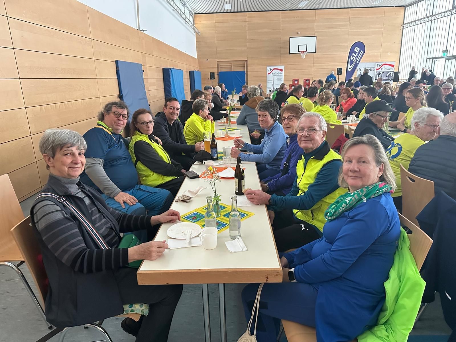 Mit einem Lächeln im Gesicht kehrten alle nach rund einstündiger sportlicher Betätigung zum Erfrischungstee zurück (die Trailrunner nach 90 Minuten). In der Halle herrschte dann ein gemütliches Miteinander, man stärkte sich mit Kaffee und Kuchen oder einer Rostwurst. Ehrenvorsitzender Hubert Beck hielt einen kurzen Abriss über die Entstehungsgeschichte des Vereins. 6 Gründungsmitglieder waren auch gekommen und wurden von der 1. Vorsitzenden besonders geehrt (siehe Bericht letzte Woche).